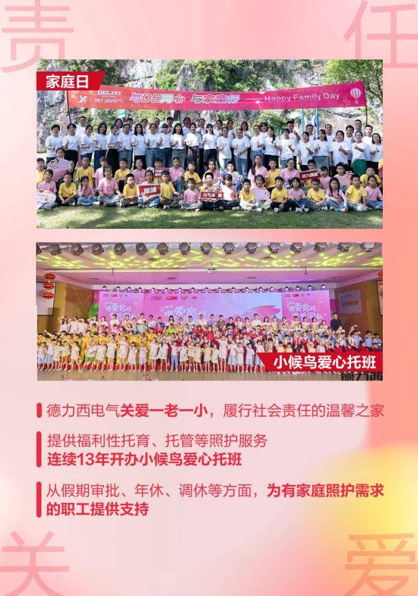 責(zé)任關(guān)愛,深化支持 德力西電氣同樣關(guān)注社會(huì)責(zé)任的履行,關(guān)愛一老一小,重視職工的照護(hù)需求,提供福利性的托育和托管服務(wù)。德力西電氣已連續(xù)13年開辦小候鳥愛心托班,惠普員工子女達(dá)到4500余人次,不僅減輕了員工的家庭負(fù)擔(dān),而且為員工子女打造了一個(gè)“學(xué)”“教”“樂”一體的成長基地。此外,德力西電氣依法依規(guī)落實(shí)假期制度,從假期審批、年休和調(diào)休等方面支持有家庭照護(hù)需求的職工,確保他們能夠在家庭生活中承擔(dān)必要的角色,同時(shí)保持職業(yè)發(fā)展。