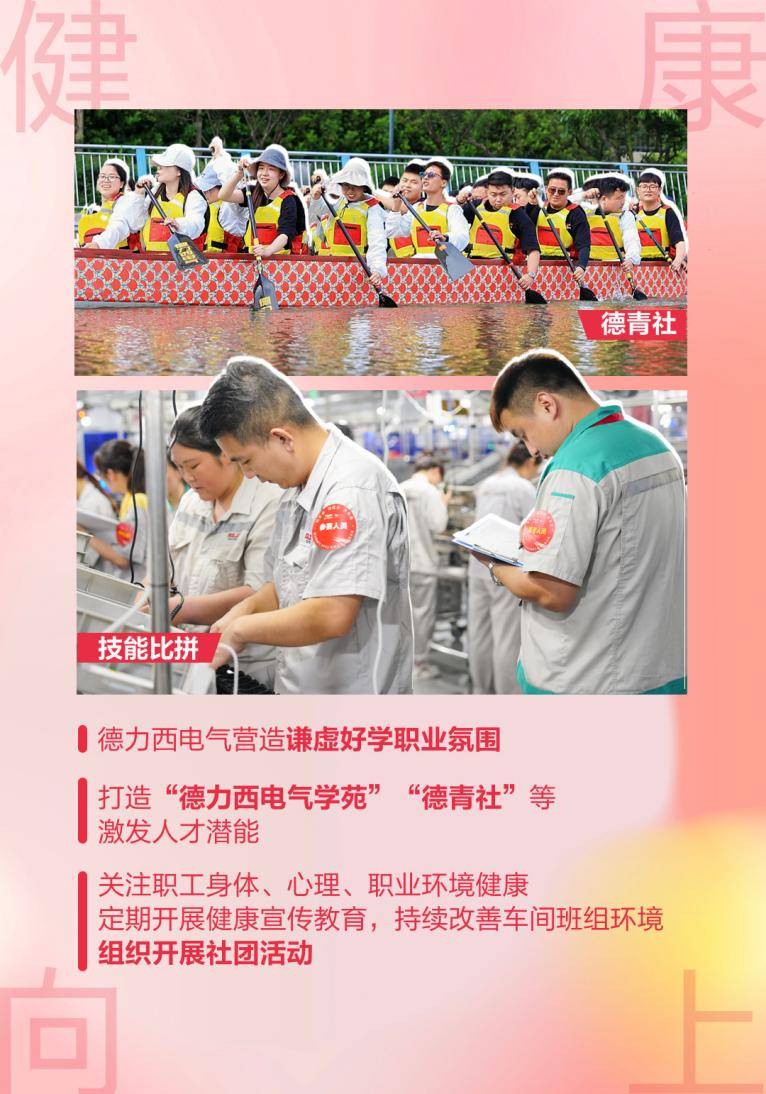 健康向上,樹立新風(fēng) 除了維護(hù)職工家庭與工作的平衡,員工的身心健康也是德力西電氣的關(guān)懷重點(diǎn),德力西電氣采取多項(xiàng)舉措保障職工健康,致力于讓職工體會(huì)到“家”的溫暖。德力西電氣關(guān)注職工身體、職業(yè)環(huán)境與心理健康,定期開展健康宣傳教育,持續(xù)改善車間班組環(huán)境,組織開展社團(tuán)活動(dòng),建設(shè)健康之家。在職場氛圍上,德力西電氣還致力于為職工提供良好的學(xué)習(xí)環(huán)境,營造謙學(xué)上進(jìn)的職業(yè)友好氛圍,打造“德力西電氣學(xué)苑”、“德青社”等,鼓勵(lì)職工增長才能,促進(jìn)自我成長,激發(fā)人才潛能。