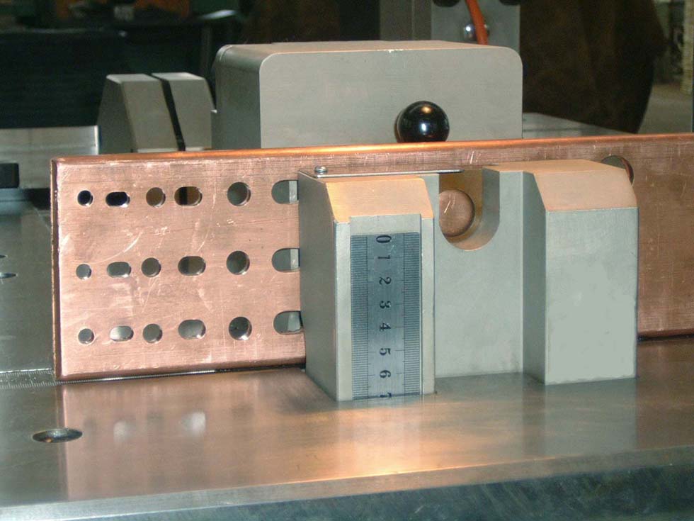 新型三工位母線折彎機,有切斷、沖孔、彎曲、校平、壓花、電纜線端頭壓接、端子導軌切斷等功能。是電氣行業(yè)大批量加工母排的高效率設備。 高效率的三工位母線折彎機,設計遵循以人為本的理念,讓工作更方便、更省力,更安全。合金鋼整體工位,一致性好,精度高,堅固耐用。適于年產值上億圓的企業(yè)使用。合理的工作面布局,三個獨立的液壓系統(tǒng),可三人同時操作,互不干擾。模具配置多,沖孔可選位,無需劃線打樣沖,圓孔腰孔隨意沖;折彎可預定角度。  高品質的三工位母線折彎機,設計時重視降低使用者的成本:放置好母線,踩踏開關即工作,松腳后,工位自動復位、停機。所以有節(jié)能、機械磨損小、油溫不高、使用壽命長等優(yōu)點。高質量的液壓元件,易維護的系統(tǒng),操作工也能進行保養(yǎng)。