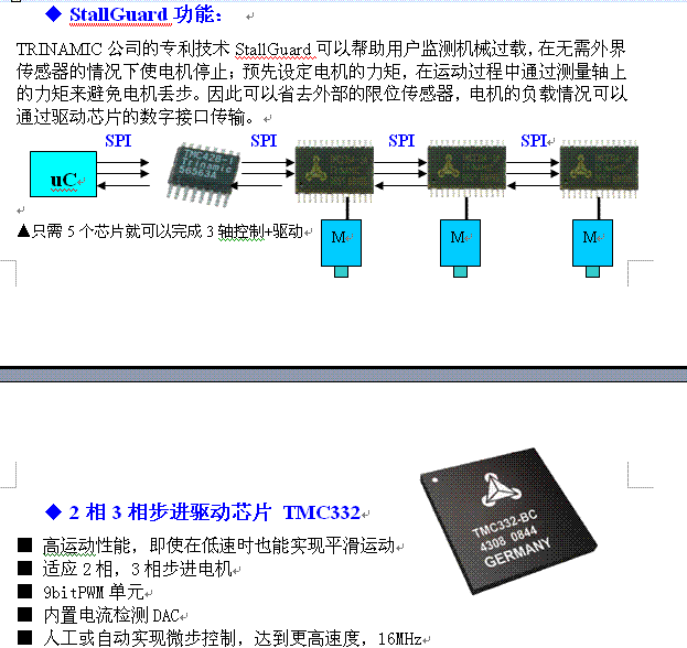 專利技術(shù)chopSyncTM:功能可以做到利用TMC236,TMC239,TMC246和TMC249驅(qū)動(dòng)芯片使步進(jìn)電機(jī)達(dá)到很高的速度,當(dāng)EMF反電動(dòng)勢(shì)產(chǎn)生的電壓高于外部提供的電壓時(shí)在此時(shí)的速度下,chopSyncTM的功能通過(guò)減少共振的發(fā)生來(lái)實(shí)現(xiàn),該功能可以使步進(jìn)電機(jī)的速度達(dá)到1000RPM。
