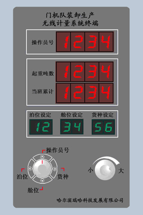 人機(jī)接口面板如圖2所示,操作員編號(hào)、起重噸數(shù)、累計(jì)重量采用大數(shù)碼管顯示,主要考慮較遠(yuǎn)的距離也能觀察到。艙位、泊位及貨種顯示用小數(shù)碼管顯示,這些信息在工作前要操作儀器進(jìn)行調(diào)整,所以只要在較近距離能夠看到就可以了,并且用綠色顯示管顯示。