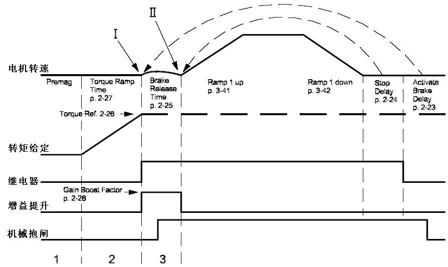 丹佛斯FC302驅(qū)動器內(nèi)置起重設(shè)備專用的機械抱閘控制輸出,上圖為其動作的時序圖,電機起動之初是工作于轉(zhuǎn)矩輸出方式的,在機械抱閘逐步松開的過程中,電機控制模式也平滑地從轉(zhuǎn)矩控制模式轉(zhuǎn)換為轉(zhuǎn)速控制模式。在過渡期間,還可以提升轉(zhuǎn)速控制的PID,有助于進一步提高驅(qū)動器的負載響應(yīng)能力。