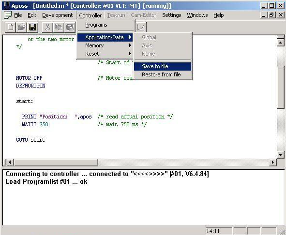 丹佛斯運動控制器使用丹佛斯公司開發(fā)的Aposs運動控制語言,其編程風格模仿C語言,并提供多種便利指令,其界面如下圖所示: