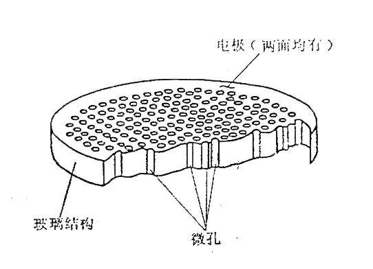 個相互平行的小的電子倍增管組成,一個電子倍增管的尺寸為,通道長幾十微米,通道長度和直徑之比為40―100,通道之間距離一般為幾十微米,通道與板的表面偏置一個角度,通常為8度,孔內(nèi)表材料的二次電子發(fā)射系數(shù)為大于等于3