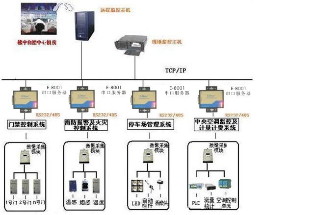 接入方式:是將前端數(shù)據(jù)采集或控制模塊(接口 RS232或RS485)通過E-8001串口通訊服務(wù)器接入以太網(wǎng),從而實現(xiàn)中心機(jī)房PC對多棟樓宇網(wǎng)絡(luò)化監(jiān)控和管理。