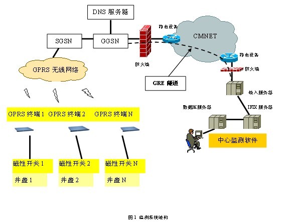 4、 GPRS終端:與磁性開關(guān)連接,接收到磁性開關(guān)的閉合信號后,通過GPRS網(wǎng)絡(luò)把報警信息傳輸?shù)目刂浦行模煽刂浦行能浖@示報警信息。
