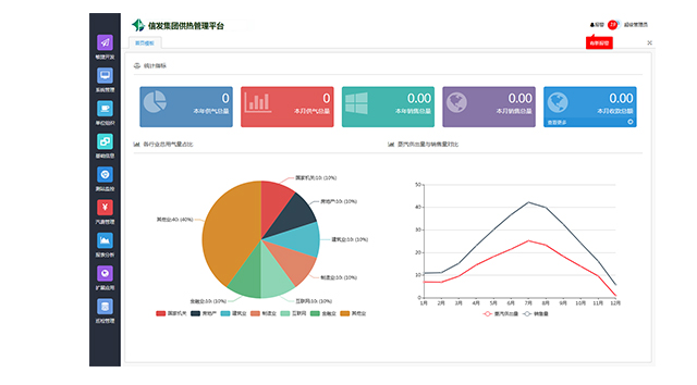 主界面信息,提供了月供汽總量、年累積量、月銷售量、年銷售總量以及月銷售收款總額;蒸汽供出量與銷售量對比圖,行業(yè)用量餅圖。