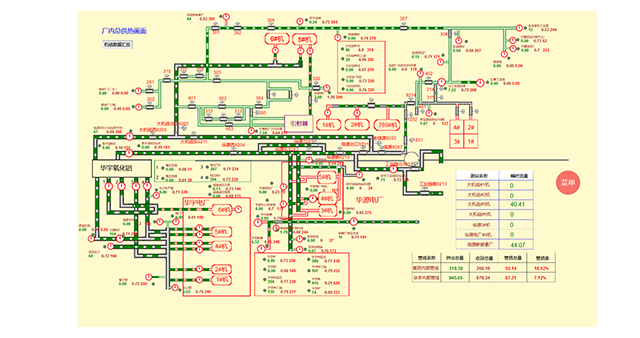 上圖是供熱管線實時運行組態(tài)展示圖,可由程序內(nèi)自帶組態(tài)插件進行修改及設置。實時顯示檢測儀表信息,區(qū)域信息以及統(tǒng)計管線漏損數(shù)據(jù)信息。